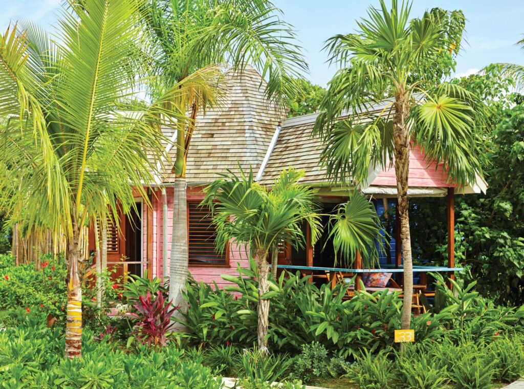 villas privadas, cabañas sobre la laguna, y caminos de piedra entre jardines caribeños.